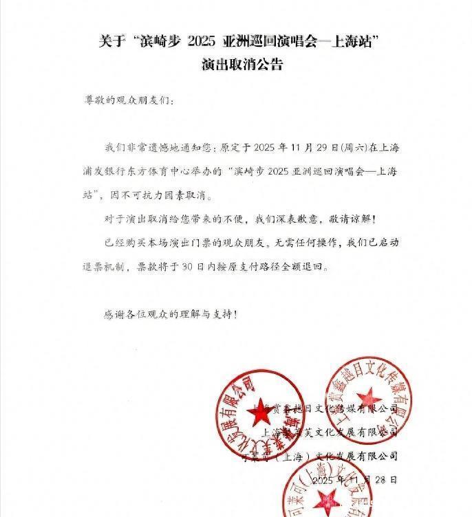 清水文化在公告中表示,由于不可抗力因素,滨崎步的上海演唱会将无法如期举行。主办方对此深表歉意,并向所有购票观众表示感谢。清水文化已启动退票机制,所有购买者只需等待,票款将在30天内按原支付路径全额退回。清水文化方面表示,这是为了确保观众的利益,避免因演出取消而产生的不便和经济损失。晚间20时左右,记者在清水文化官方社交媒体账号上看到发布的信息。根据清水文化提供的信息,本次演出原定在2025年11月29日晚在上海的某个场地举行。滨崎步通过精湛的歌唱技巧和独特的人声处理,逐步建立了她在亚洲乃至全球的音乐影响力。她以其独特的声音和翻唱歌曲而广受欢迎。